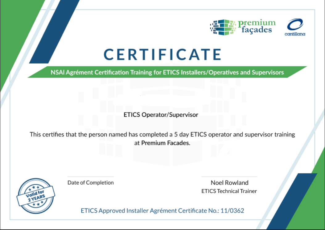 Join our NSAl Agrément Certification Training for ETICS Installers/Operatives and Supervisors course to provides comprehensive training for the installation of External Thermal Insulating Composite Systems (ETICS) in compliance with NSAI Agrément standards. It combines 3 days of online learning with 2 days of practical, instructor-led training on-site, covering all essential aspects from theoretical knowledge to hands-on application, ensuring participants are fully prepared for certification and high-quality installation.
